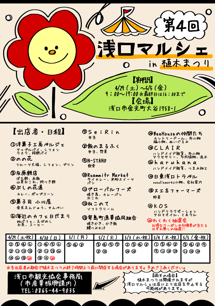 また、浅口マルシェの出店者によっては、メニューが変更になる場合や植木まつりの開催時間より前に終了する場合がございますので予め、ご了承ください。