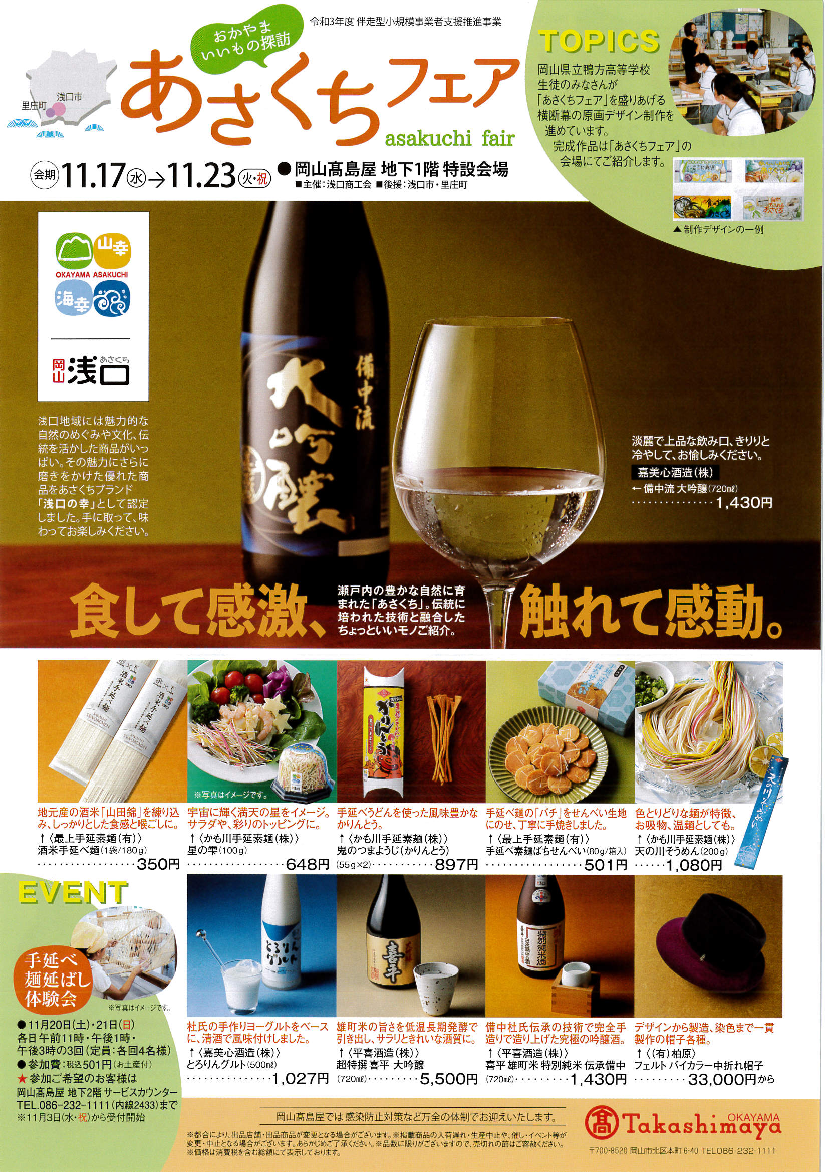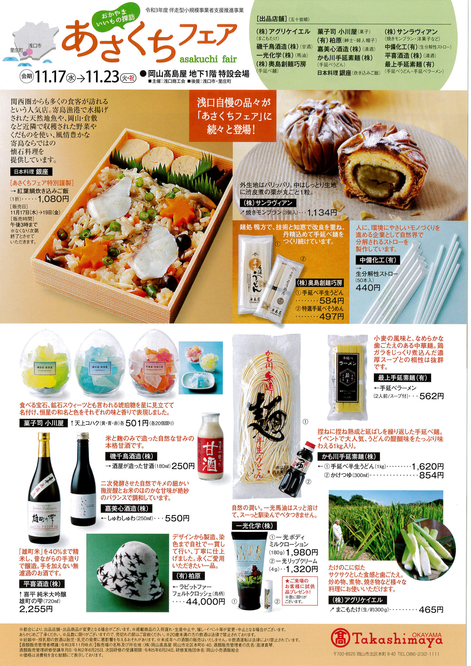 【あさくちフェアin岡山高島屋】 期間:令和3年11月17日(水)~23日(火・祝) 場所:岡山高島屋 地下1階 特設会場