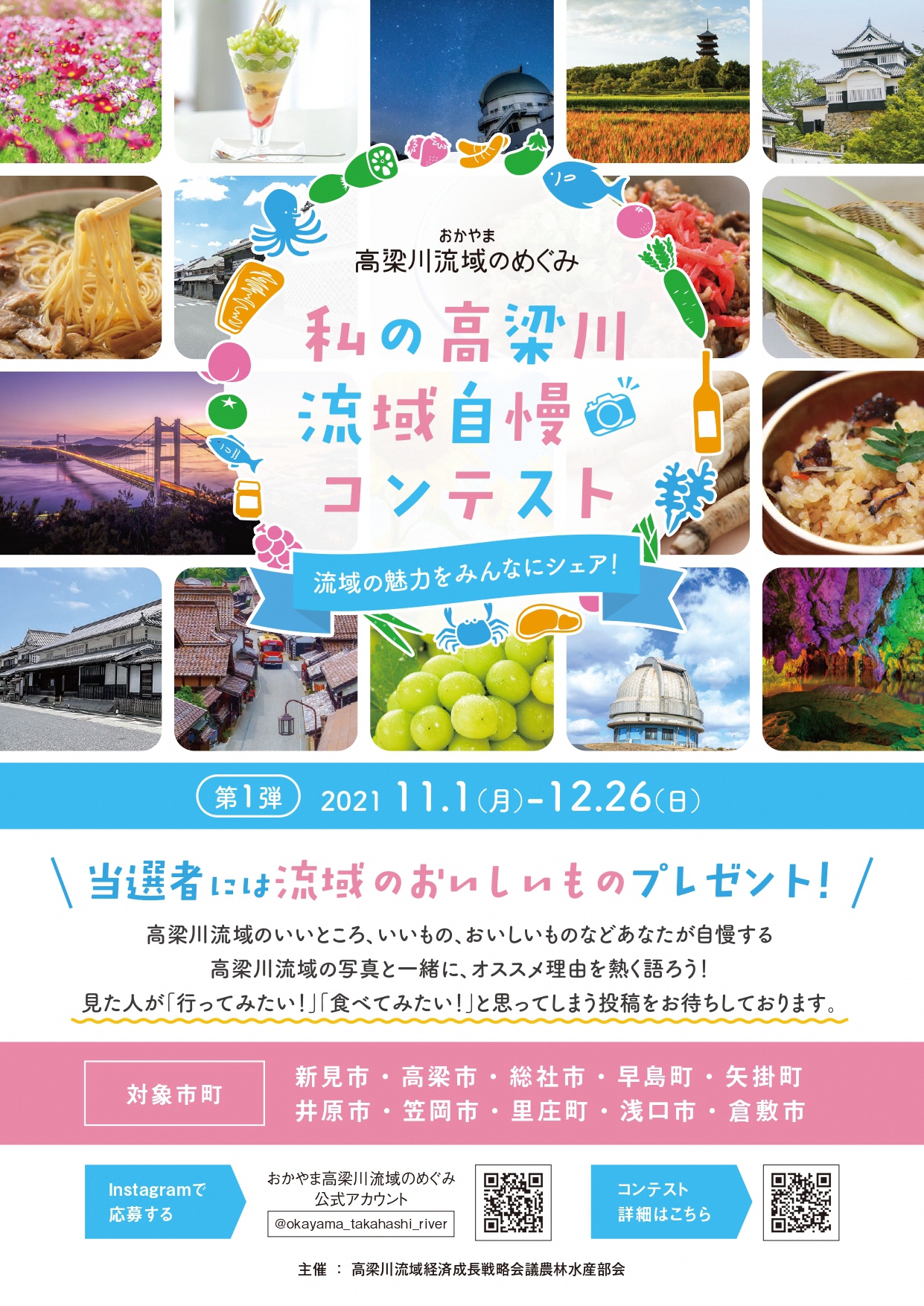 高梁川の豊富な水、降り注ぐ太陽と温暖な気候に恵まれたこの地域には、豊かな農林水産物と素晴らしい景観、そしておいしいグルメが溢れています🌳そんな高梁川流域のいいところ、いいもの、おいしいものなどあなたが自慢したい高梁川流域の写真と一緒に、オススメ理由を熱く語る企画が開催されています✨👏インスタグラムに、見た人が「行ってみたい!」「食べてみたい!」と思うような投稿をして、コンテストに参加しよう!当選者には流域の美味しいものがプレゼントが用意されているそうです✨応募は、郵送でも可能😊