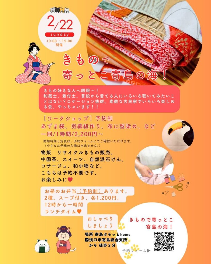 あずま袋・羽織紐作り・型染め体験の予約制ワークショップや、リサイクルきもの販売など。