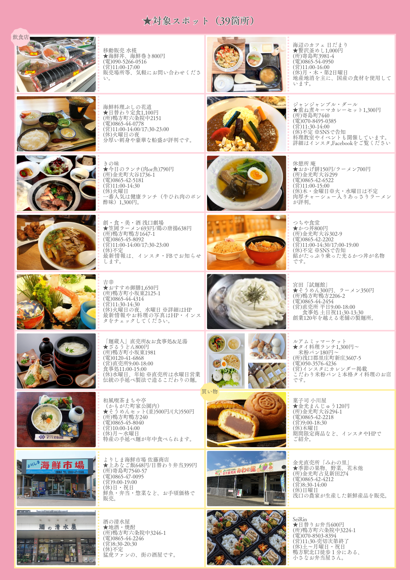 移動販売「水椛」/海辺のカフェ 日だまり/海鮮料理 ぶしの花道/ジャンジャンブル・ダール/きの味/休憩所 庵/創・食・美・酒 浅口劇場/つちや食堂/吉幸/宮田「試麺館」/「麺蔵人」直売所&お食事どころ&足湯」/ルアムミッマーケット/和風喫茶まちや亭(かもがた町家公園内)