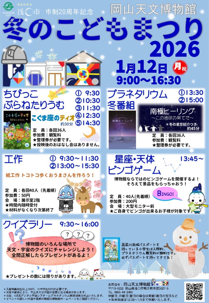 1月12日(月・祝)に岡山天文博物館で「冬のこどもまつり2026」を開催します⛄